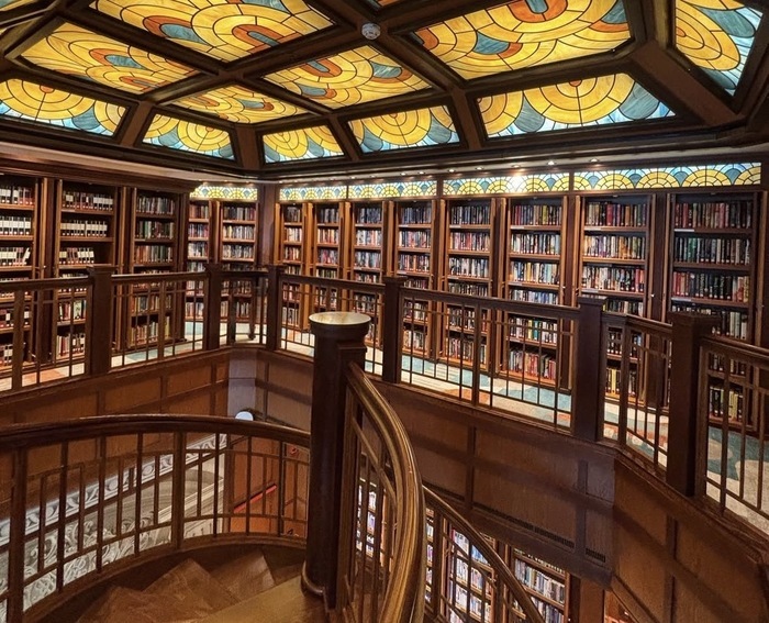 ぐるりと円を描く螺旋階段、世界中から集まった約6,000冊の本が並んでいます。こちらの本は、船内で読書するのは勿論、自身が持ち込んだ本と交換することも可能。
