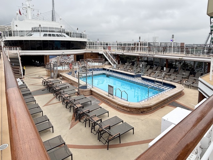 プールは船上の屋外に2つあり、中央にあるのがパビリオン・プールになります。泳いでみたり、開放感溢れるプールサイドで、シャンパン片手に寛ぎの時間を過ごしてみたりリラックスタイムを存分に楽しめる場所です。