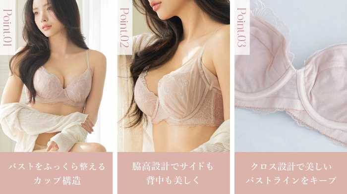 カップ横とサイドのパワーネットが脇肉をしっかりキャッチし、クロス設計で動いても美しいバストラインをキープします。
