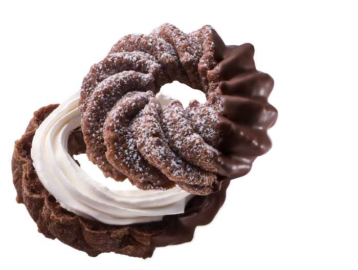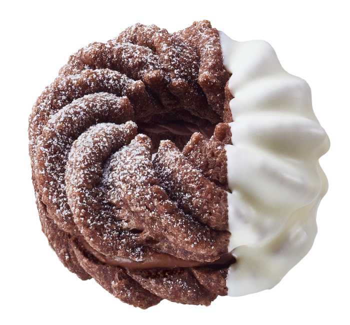ショコラフレンチ生地に、ザクザク食感がアクセントのチョコクリームをサンド。仕上げにホワイトチョコをコーティングした新登場フレーバー。