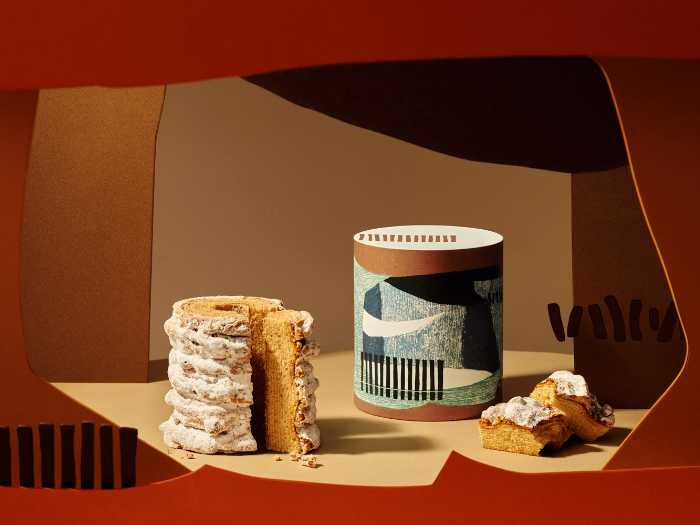 ザクザクとふんわり、2つの食感を楽しめるマカロンバームクーヘン。冬の放牧牛乳を使ったしっとり生地にマカロン生地を重ねて二度焼きし、木肌のような仕上がりに。