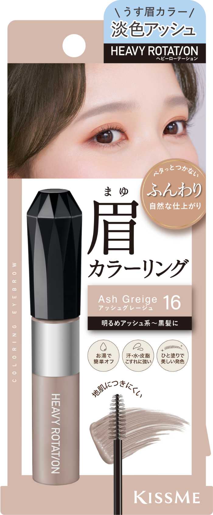 大人気の眉マスカラ「キスミーヘビーローテーションカラーリングアイブロウEX」に、新色アッシュグレージュが仲間入り。肌になじむ明度の高いアッシュにほのかな赤みをプラスした絶妙カラーで、憧れの“うす眉”印象を叶えます。黒髪や暗髪にも自然になじむ注目カラーです♡