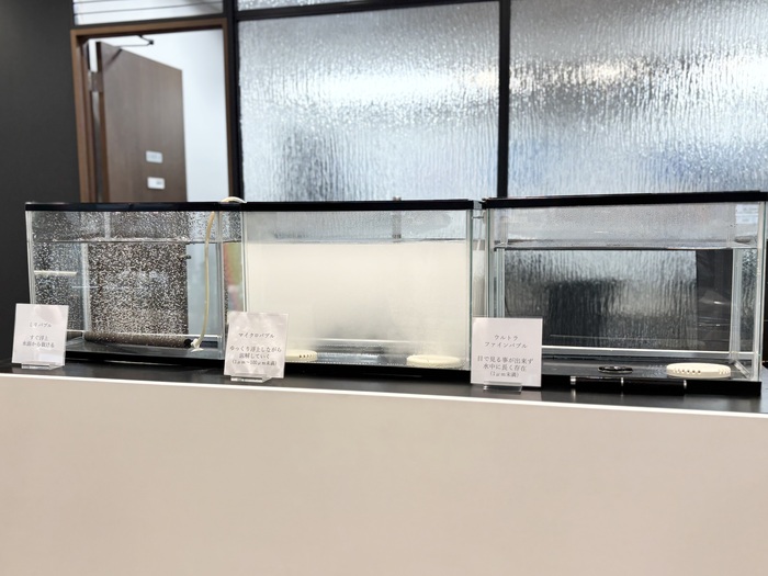 サイエンスの全商品の体感のほかに、ファインバブル発生の仕組みを実際に見学出来るスペースがあり、水槽の中で発生するファインバブルの気泡の動きの違いを見学し、特徴について学ぶことができます。