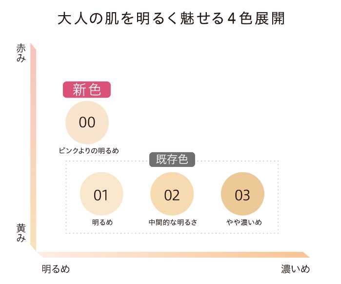 既存色01~03に加わる明るめピンクオークル。透明感を高めるブルーパールに加え、新たにピンクパールを配合。