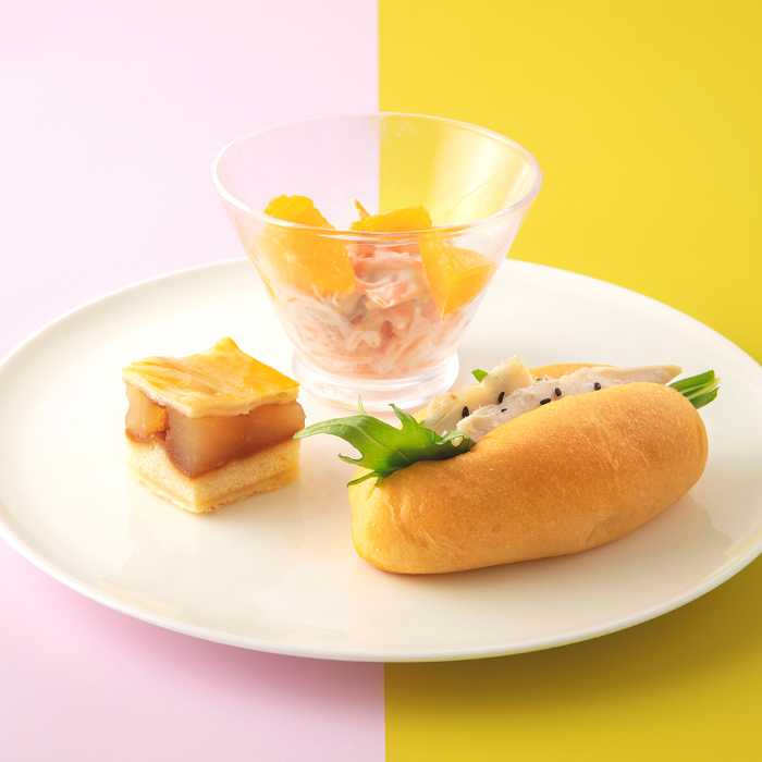 オレンジコッペパンの柚子胡椒チキンサンド/人参の白和え/アップルパイ