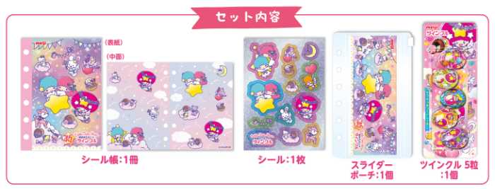 セット内容は、ツインクル(1個)、シール帳(1冊)、ホログラムシール(1枚)、スライダーポーチ(1個)。ここでしか手に入らない限定デザインです。