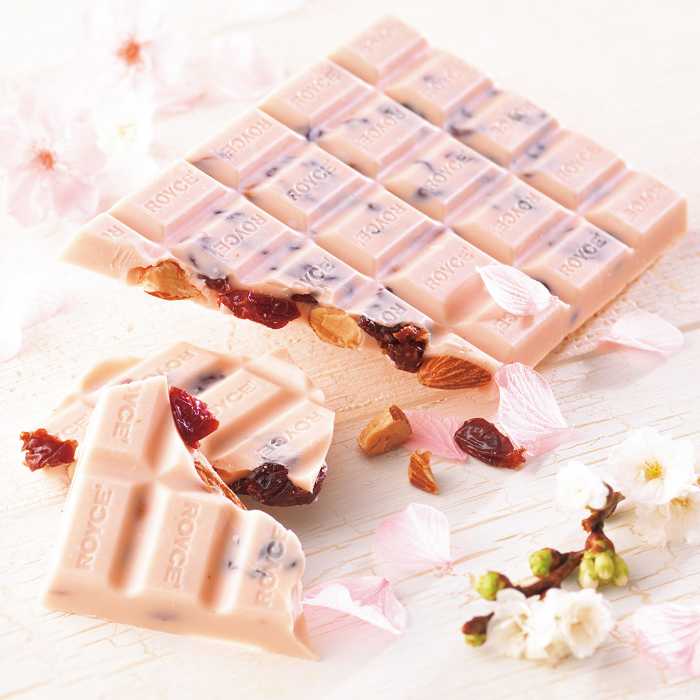 ホワイトチョコレートにストロベリーパウダーと桜の葉を加え、ドライチェリーとアーモンドを散りばめた、甘酸っぱく香ばしい味わいが広がります。