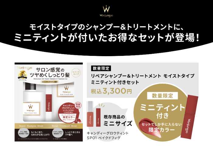 韓国アイドルメイクを牽引するメイクアップアーティスト、ウォン・ジョンヨ氏監修のヘアケアラインから、今だけの特別なセットが登場します。人気のモイストタイプに限定ミニティントが付いた数量限定アイテムは、毎日のヘアケアとメイクを同時に格上げしてくれる嬉しい内容♡全国発売となるこの機会をお見逃しなく。