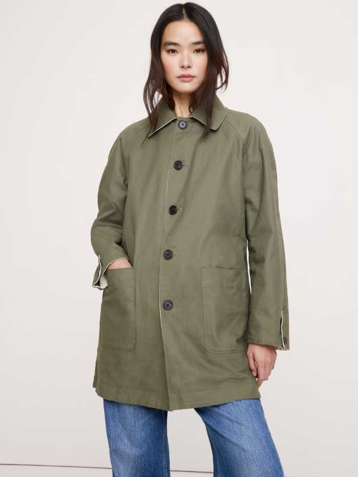 ショートリバーシブルコットンカーコート(38,000円)は、クリームとオリーブグリーンのリバーシブル仕様。
