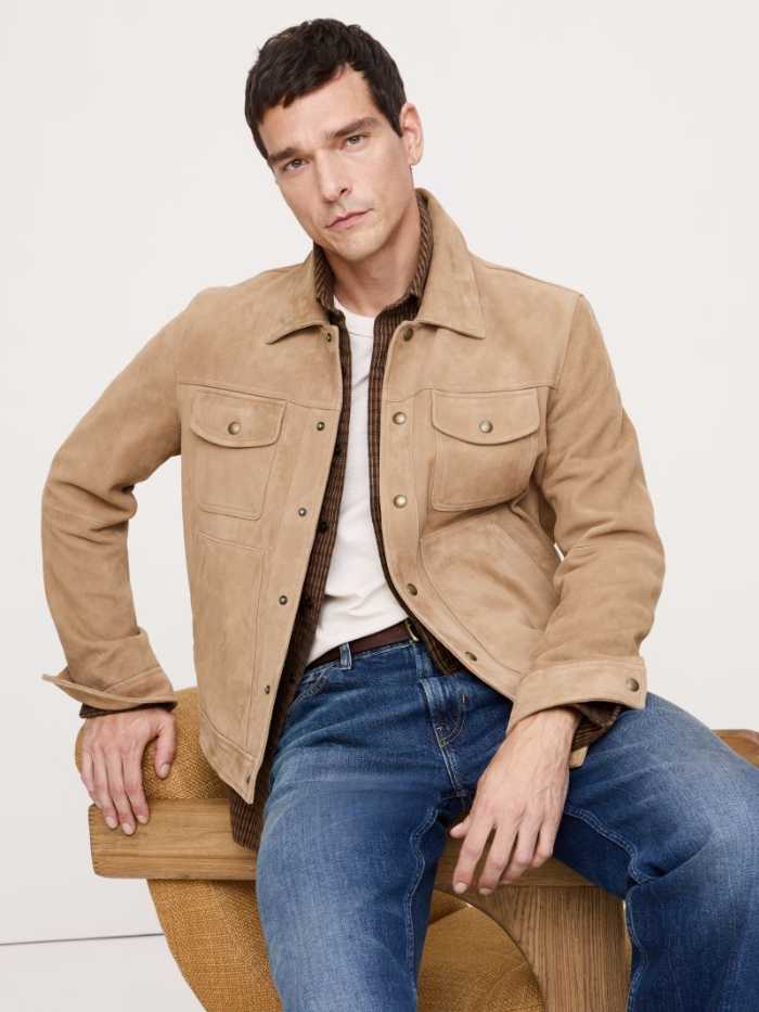 スエードトラッカージャケット(99,000円)はゴートスエード100%を使用。着るほどに風合いが増し、旅にも映える実用的なデザインです。