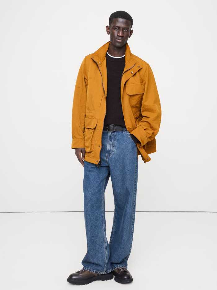 ウォーターレジスタントパーカ(40,000円)はオンラインサイト限定。90年代モデルから着想を得た撥水仕様で、リラックスフィットや内蔵フード付きスタンドカラー、豊富なポケットを備えています。