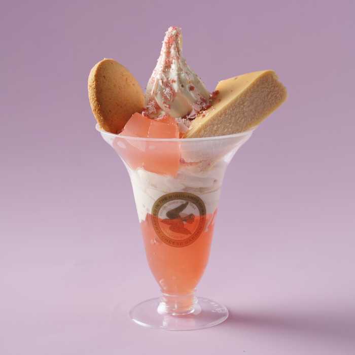 国産白桃ピューレを使った白桃ゼリーに、ベイクドチーズケーキ風味のチーズケーキソフトを重ね、『御用邸さくらチーズケーキ』と『御用邸ストロベリーチーズクッキー』をトッピングしています。