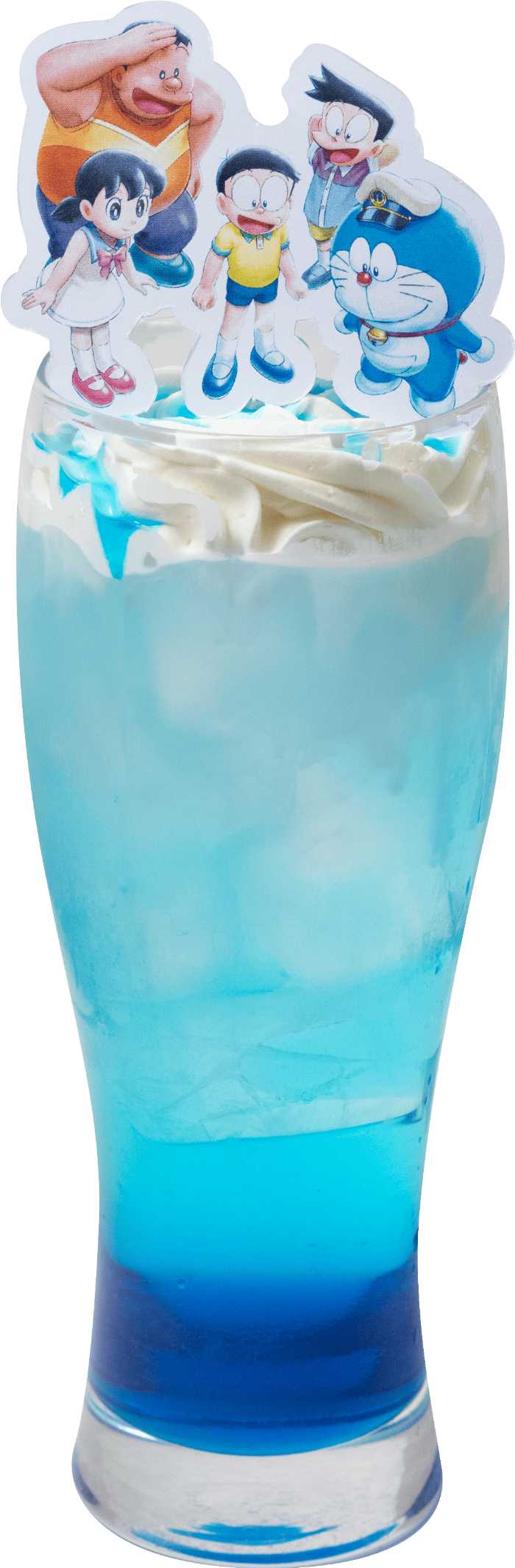 税込850円の「深海ブルーソーダ」は、グラスの中に広がる海底の世界をイメージ。海面に立つドラえもんたちの印象的なシーンを再現した、写真映えも抜群の一杯です。