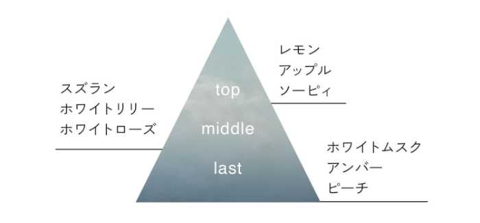 やがてスズランやリリーの清楚でほんのりパウダリーなホワイトフローラルが、心を包み込むように漂います。