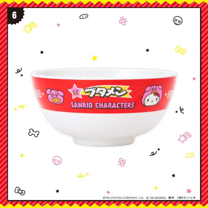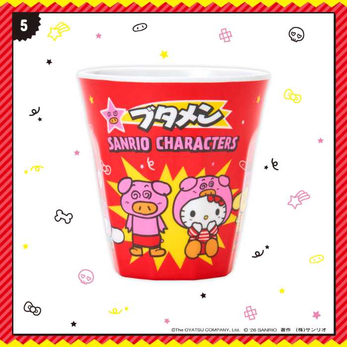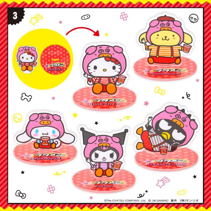 1993年の発売以来30年以上愛されてきた「ブタメン」。今回のコラボでは、ハローキティ、ポムポムプリン、シナモロール、クロミ、バッドばつ丸がブタメンくんになりきったオリジナルデザイン全18アイテムが登場します。
