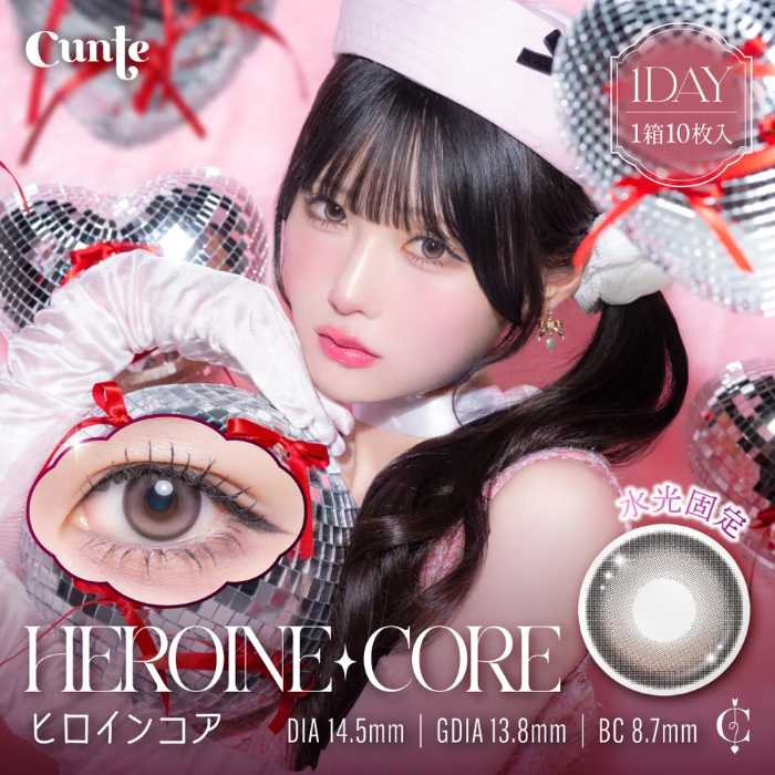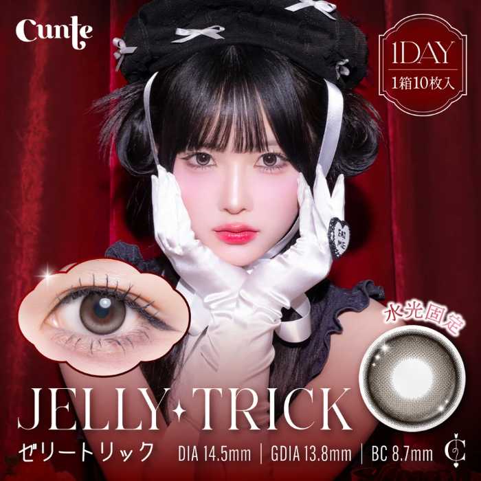 ゼリートリックとヒロインコアは、水光LOCK設計でハイライトをキープする“水光LOCK”シリーズ。どちらもDIA14.5mm、着色直径13.8mm、BC8.7mmです。