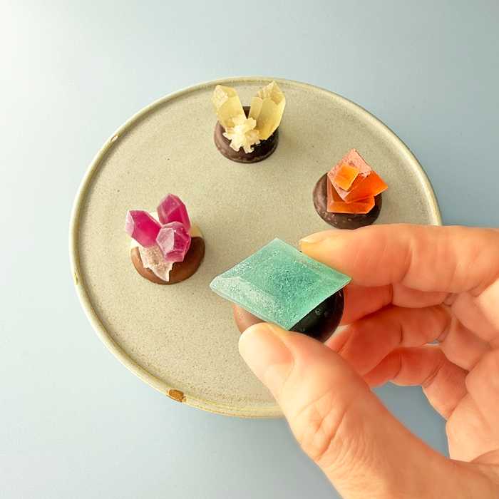 寒天を小刀で切り出した鉱物のような造形と、琥珀糖の食感、九州素材の味わいを楽しめます。