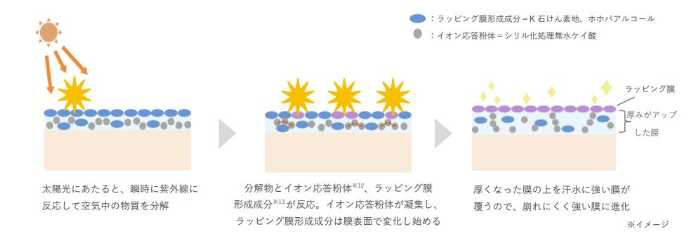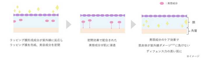 紫外線をスイッチに肌の上の膜が自動で進化し始める「瞬間オートディフェンステクノロジー※7」を搭載し、膜が厚みを増しながら汗や水、こすれに強いラッピング膜を形成します。