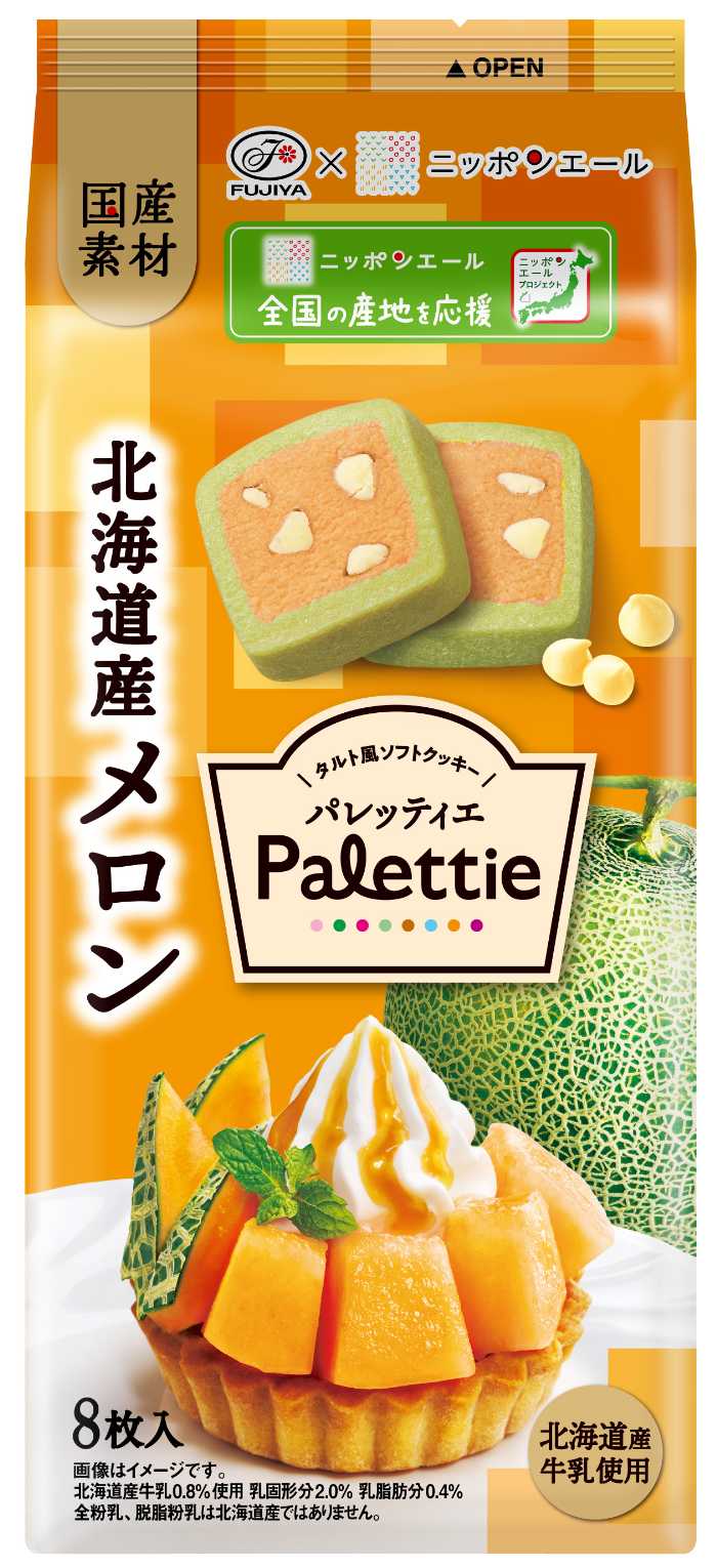 「パレッティエ(北海道産メロン)」は、北海道産メロン果汁と国産米粉、ホワイトチョコチップを練り込んだしっとり生地に、北海道産牛乳を使用したサクホロ生地を合わせたソフトクッキーです。