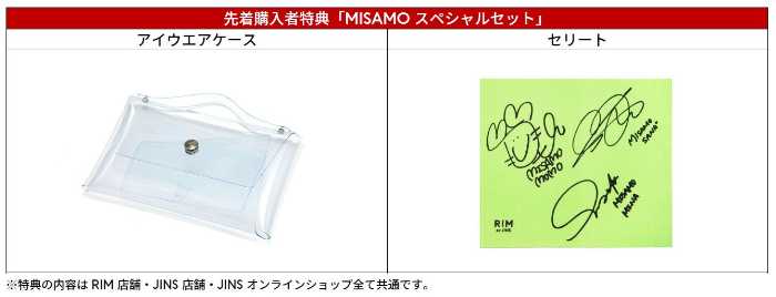 RIM全店舗やJINSオンラインショップなどで、MISAMOがコンセプトフィルムで着用した対象商品を購入すると、ブランドアンバサダー就任を記念したオリジナルアイウエアケースとセリートのセットが先着でプレゼントされます。