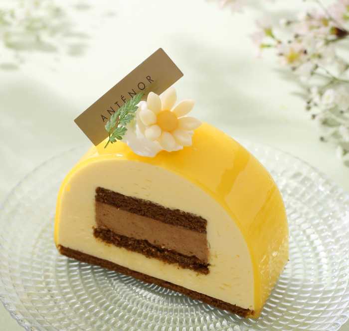 紅茶のアーモンドスポンジにアールグレイ香るショコラムースをサンドし、レモンとはちみつのムースで包んだ爽やかな一品。甘酸っぱさと紅茶の香りが調和した軽やかな味わいです。