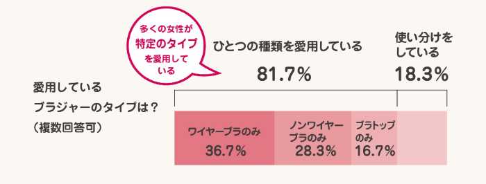 ワコールが20代~50代女性2,000人を対象に行った調査では、「ワイヤーブラのみ(36.7%)」が最多で、「ノンワイヤーブラのみ(28.3%)」「ブラトップのみ(16.7%)」が続きました。