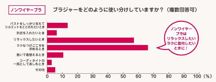 ワイヤーブラは「バストをしっかり支えてシルエットをととのえたいとき(80.1%)」に選ばれ、ノンワイヤーブラは「ラクなつけごこちを求めるとき(66.3%)」、ブラトップは「ラクなつけごこちを求めるとき(65.3%)」と快適性を重視する傾向が見られました。