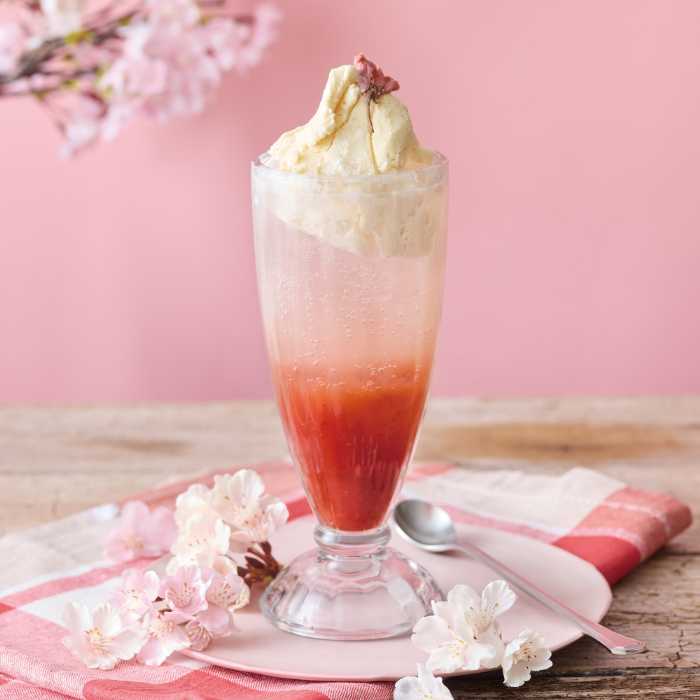 桜と苺の華やかな味わいにミルクバニラアイスを合わせた春限定クリームソーダ。見た目も可愛らしく、ミルクレープと一緒に楽しむのもおすすめです♪