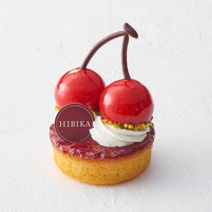 甘酸っぱいチェリーのムースを真っ赤なさくらんぼの形に仕上げました。香ばしいアーモンド生地とともに味わえます。