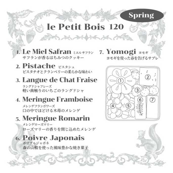 「森の恵みクッキー プティボワ120 Spring」は、手のひらサイズの缶に春の素材を詰め込んだミニサイズ。厳選された7種類のクッキーアソートが楽しめる、コンパクトながら満足感のあるセットです。