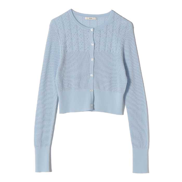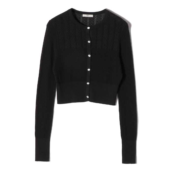 レースのような透け感のある編地が軽やかな印象のカーディガン。綿100%素材を使用し、シルクのような光沢と滑らかな肌触りを実現しています。