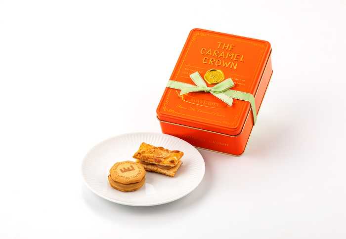 ブランドカラーであるオレンジ色が華やかなスイーツ缶は、「キャラメル王室からの贈り物」がデザインテーマ。
