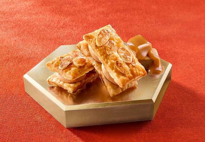 『キャラメルミルフィーユ』は、優しい甘さのバターキャラメルショコラクリームを、108層の軽やかなパイ生地でサンド。