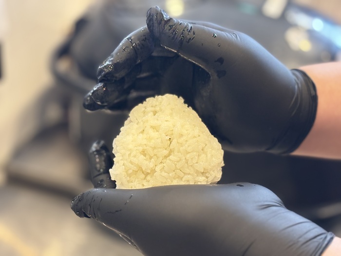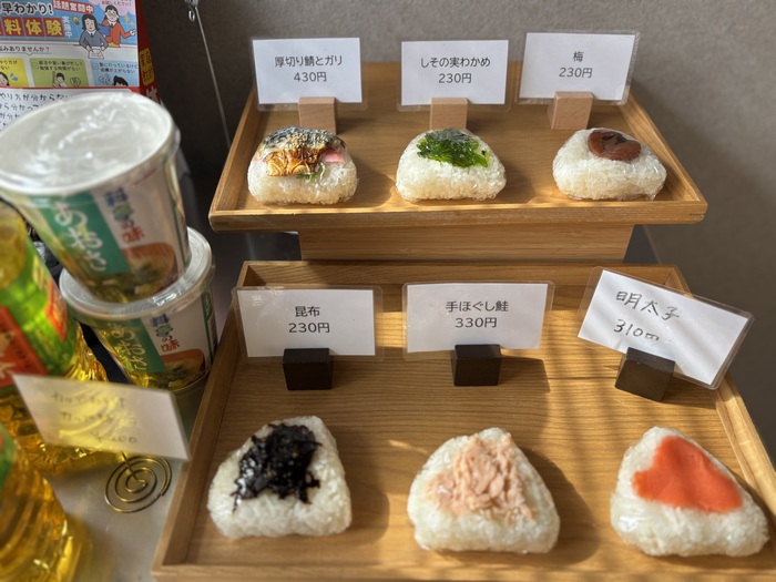 店頭には、時間のないお客様でもすぐに購入可能なおむすびも販売されています。海苔は後から巻くパリパリタイプと、こちらに巻いてから提供と好みを選べます。