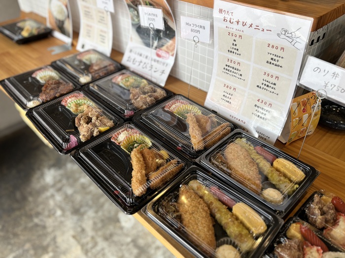 日替わりのお弁当も販売されており、「のり弁当」や「日替わり弁当」など、種類豊富なお弁当が並んでいます。ご飯は、注文後に温かいご飯を入れていただけるので、熱々をいただけるのは嬉しい!