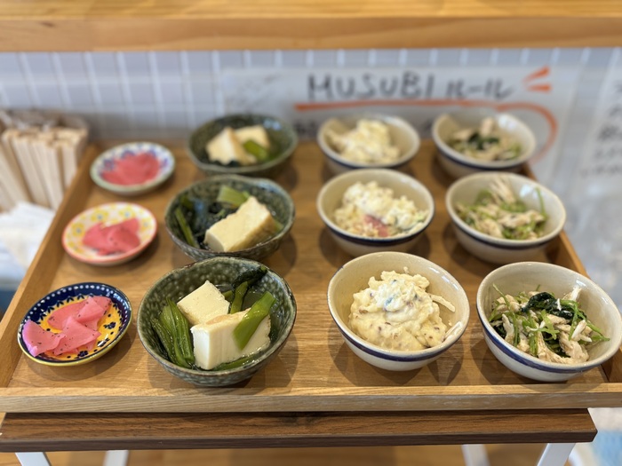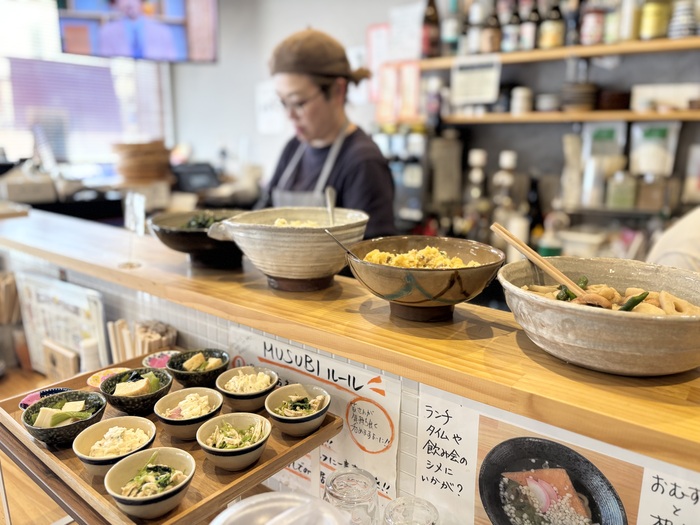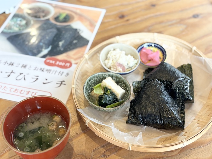 おむすびは、店内にて好きなおむすびに、プラス300円で小鉢2種とお味噌汁つきの「おむすびランチ」をいただくこともできます。