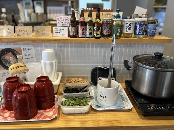 お味噌汁はセルフサービス、わかめやネギなどの具材をいれて、お味噌汁を注ぐだけ、お弁当のテイクアウトでお味噌汁も無料。