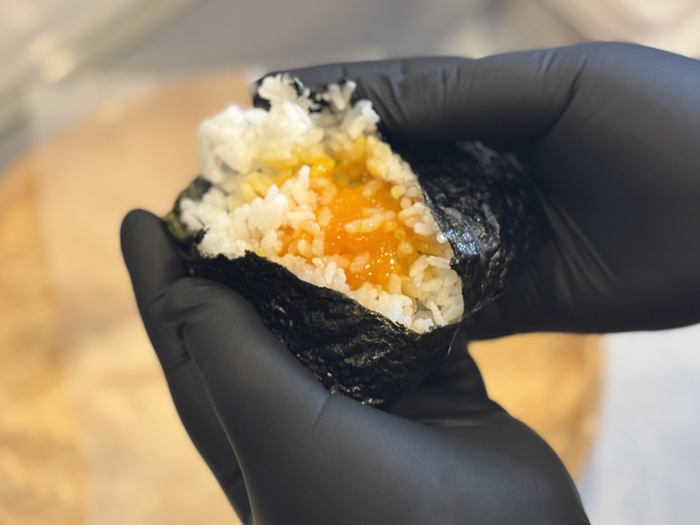 「卵黄の醤油漬け」。ふっくらとした、アツアツのおむすびの中に、とろりと濃厚な卵黄、ご飯との相性抜群!