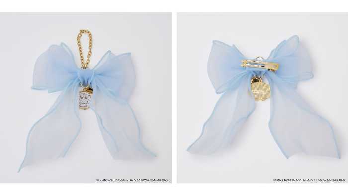2wayバッグチャームは5,500円。ふわふわとしたオーガンジーリボンにシナモロールとミルクの金具プレートが揺れるデザインです。