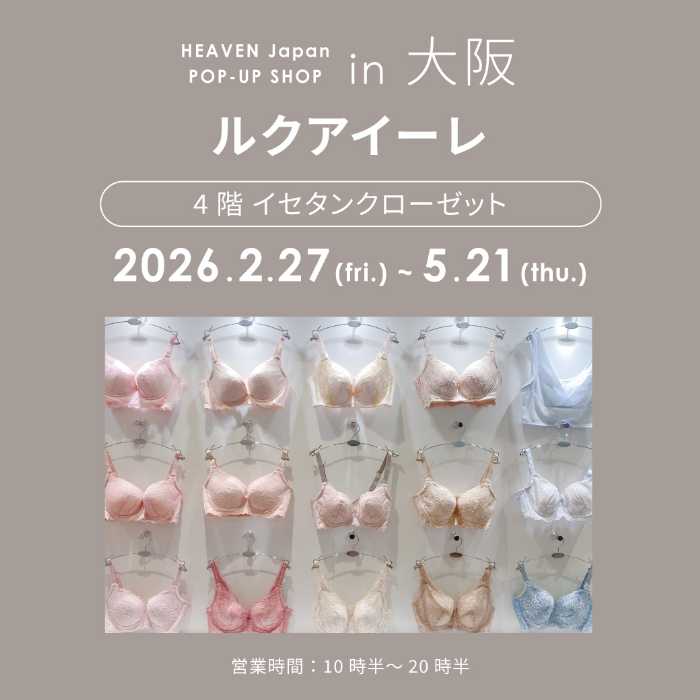 女性一人ひとりの体に寄り添う「適正下着®」を提案するHEAVEN Japanが、ルクア大阪にて期間限定のポップアップショップを開催します。プロのアドバイザーに相談しながら、自分に合ったサイズや下着選びを体験できる特別な機会です。気軽に試せるフィッティング体験で、新しい下着選びを始めてみませんか♡自分の体にぴったりの一枚を見つけたい方におすすめです。
