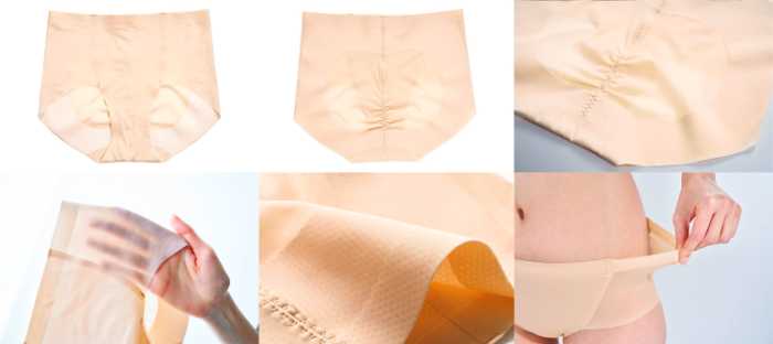 薄手でさらりとした素材ながら、ヒップ部分にはギャザーとハート型の補整生地を採用し、自然な丸みのあるラインを演出。