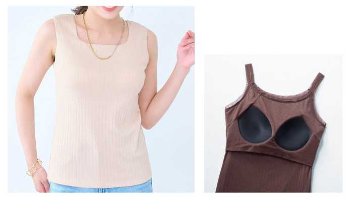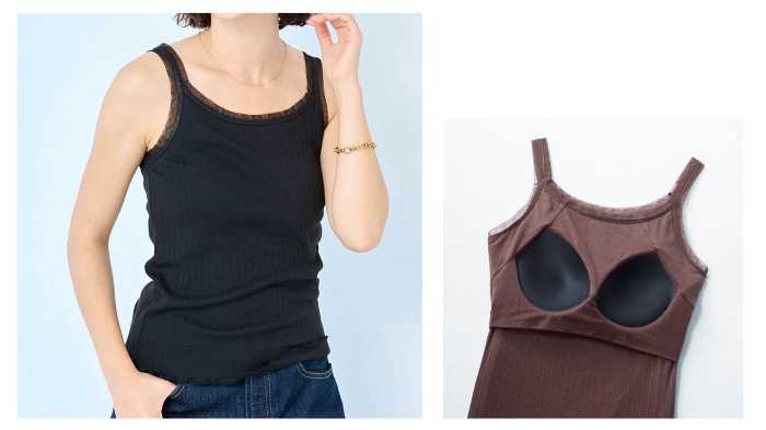 「冷やしさらっとコットン・チュール使いのワイドリブブラタンクトップ」は価格2,490円、カラーはブラック・ライトベージュ・ダークブラウンの3色展開、サイズはS・M・L・LLの4サイズ。