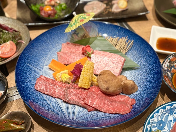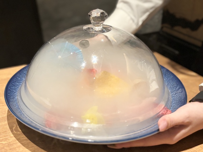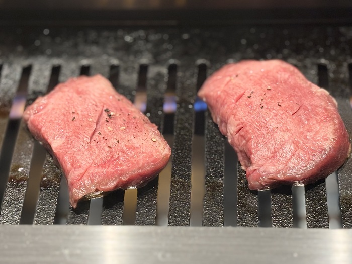 真っ白な煙の演出と共に登場するお肉、サプライズにもぴったりな演出はお写真動画映えもバッチリ!この日のお肉は、シンシン・ヘッドバラ・ヒウチなど5種類の盛り合わせ。