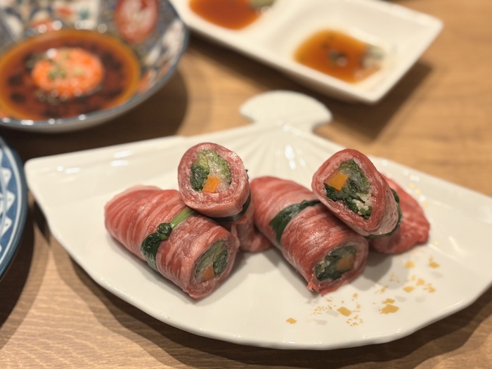 すき焼きを焼きしゃぶスタイルでいただける「和牛すき菜包み」。白菜・水菜・にんじん等のお野菜を和牛で包みこんだ一品です。