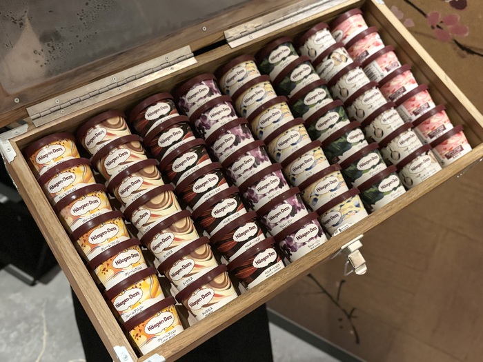 コースのデザートは、なんと!ハーゲンダッツ!トランクで登場する種類豊富な、ハーゲンダッツから自分好みを選べます。この日は、ストロベリー・ベルギーショコラ・ラムレーズンなど8種類から選べました。