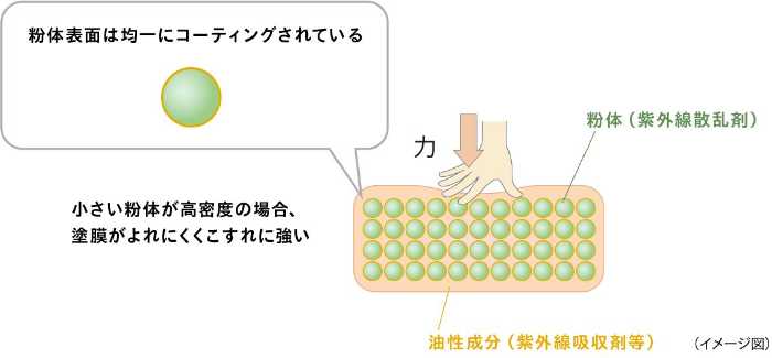 紫外線散乱剤の粉体表面を均一にコーティングすることで、肌に密着してこすれに強いフリクションプルーフ性能も備えています。