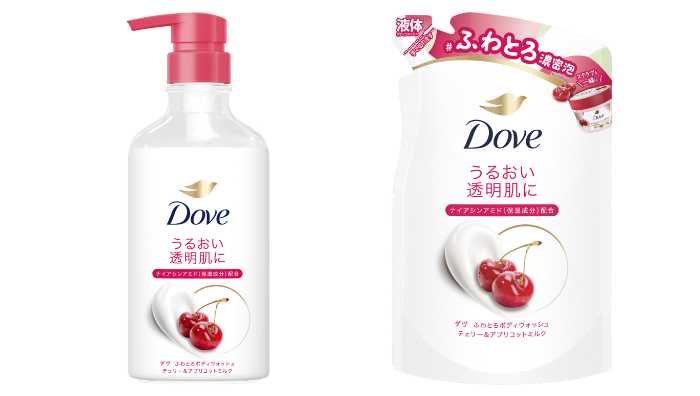 「ダヴ ふわとろボディウォッシュ チェリー&アプリコットミルク」は、ポンプ450gとつめかえ340gの2タイプで展開。