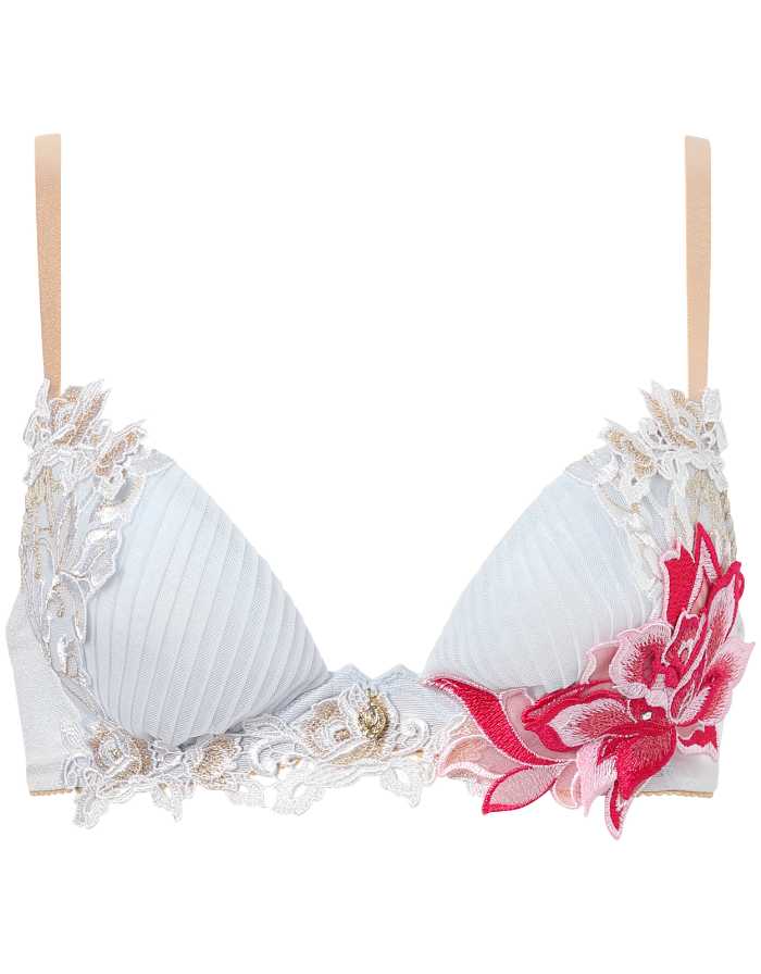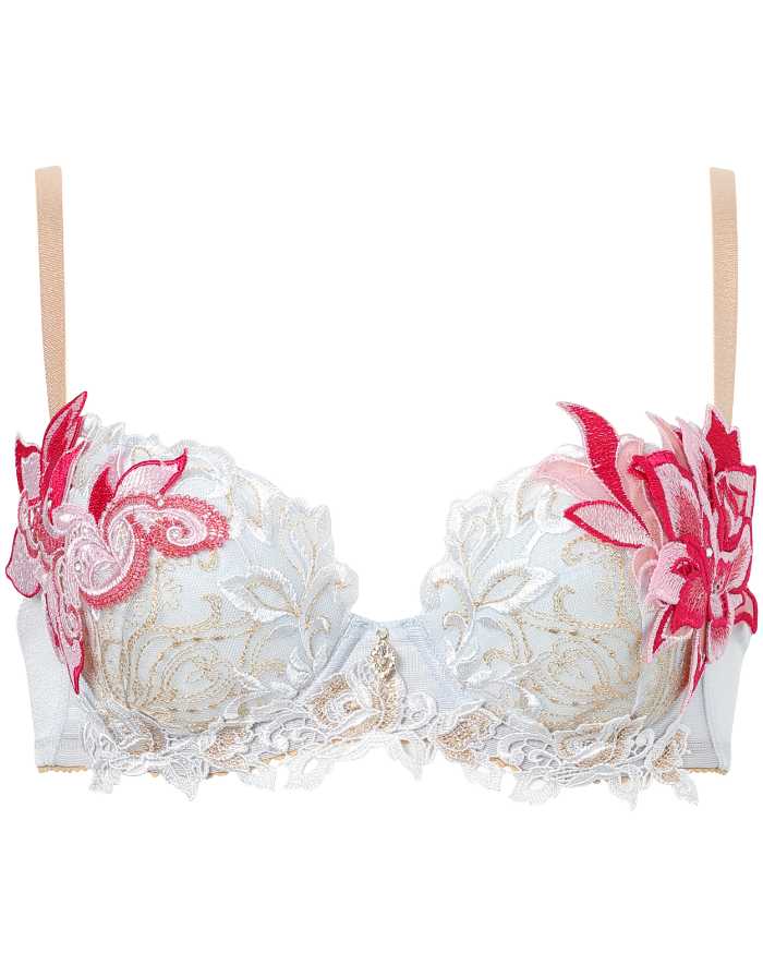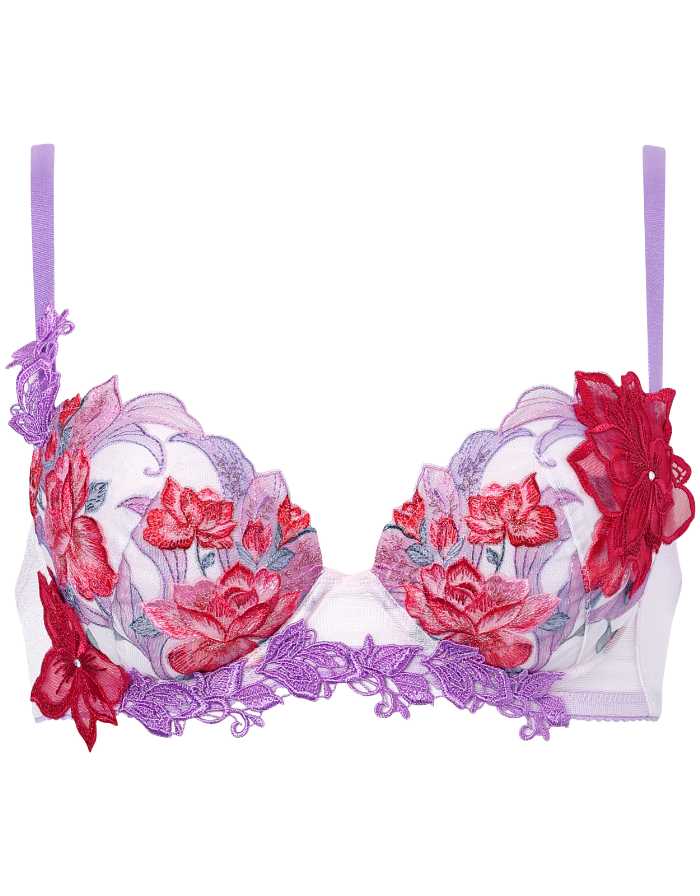 バストボリュームを脇から中央に寄せ、美しい谷間をメイクするサルート定番ブラジャー。クレマチスの花をイメージした存在感のあるアップリケと刺繍レースが華やかさを演出します。