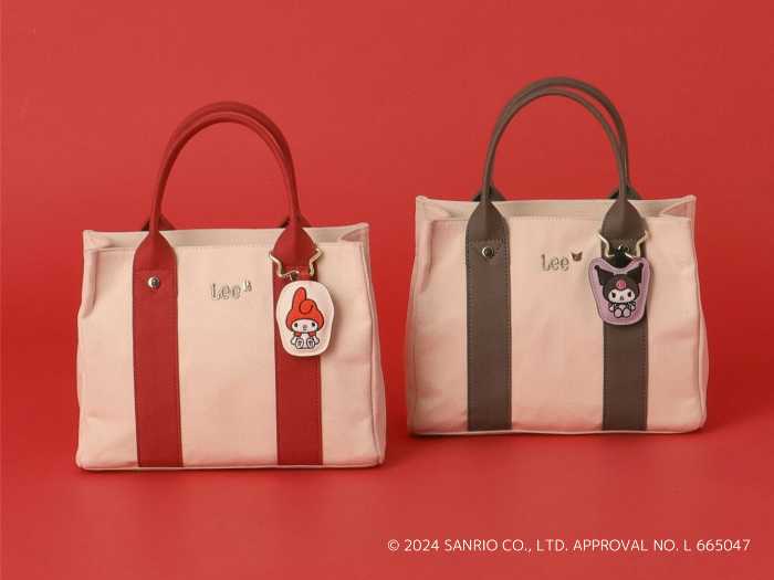マイメロディ&クロミの刺繍チャームが付いたトートバッグ。フロントの“Lee”ロゴの横にはキャラクターシルエットのスタッズをさりげなく配置。