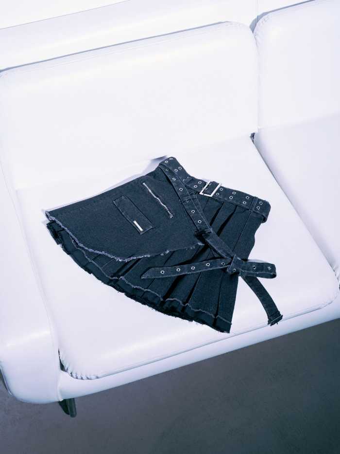 ダブルベルトとクラッシュ加工の裾が印象的なミニスカパン。ペチコート付きで、かっこよさと安心感を両立した一着です。